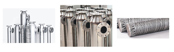 降低溫度梯度,提高換熱管的表面光潔度,采用螺旋纏繞結(jié)構(gòu),極大的改變流體的流動狀態(tài),形成了強烈的湍流效果,流體在離心力的作用下對管壁有較強的沖刷作用,自動沖刷管路,提高流速為5.5m/s(傳統(tǒng)設計為1.2m/s)起到不易結(jié)垢并且可以沖刷污垢。